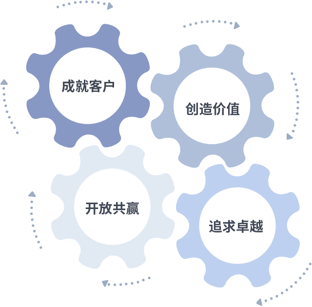 成就客户是一切决策的出发点,,,创造价值是衡量所有工作的标准,,追求卓越是我们做事做人的态度,,,开放共赢是我们的格局也是最终的结果。。。。价值观的齿轮环环相扣,,,,推动着组织里的每个人不断向前。。